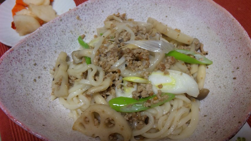ひき肉と焼うどんを組み合わせてみました